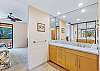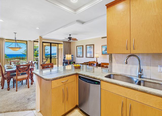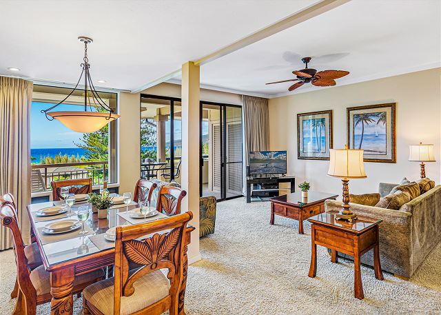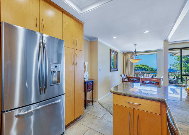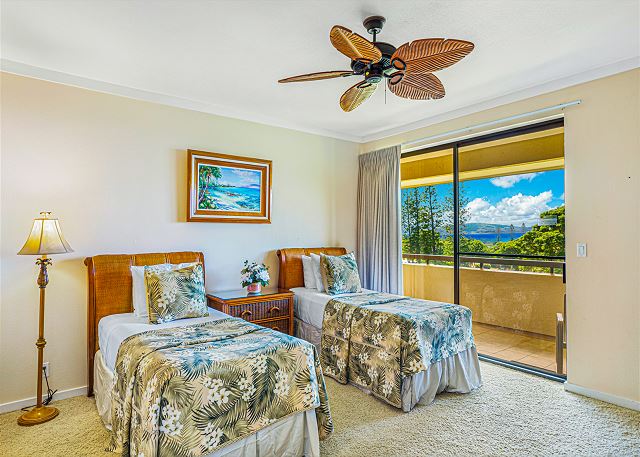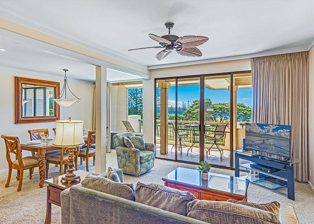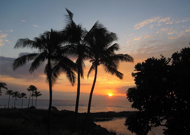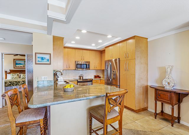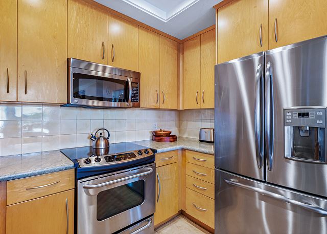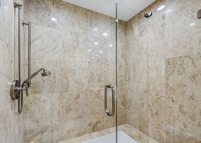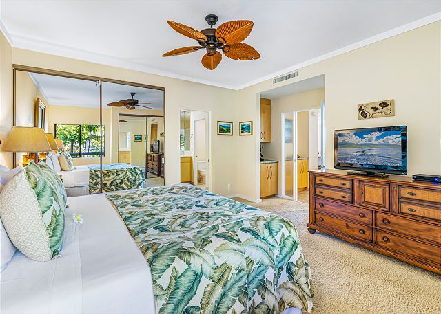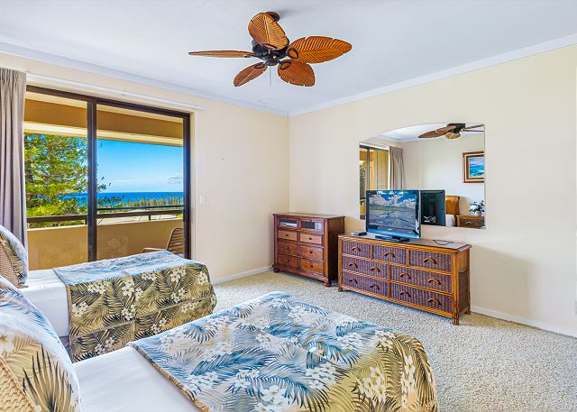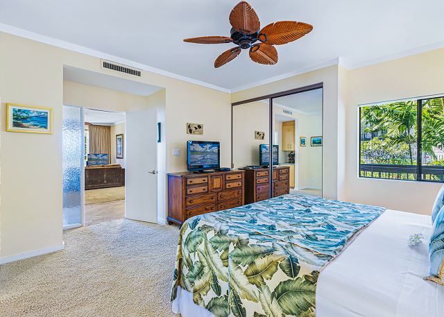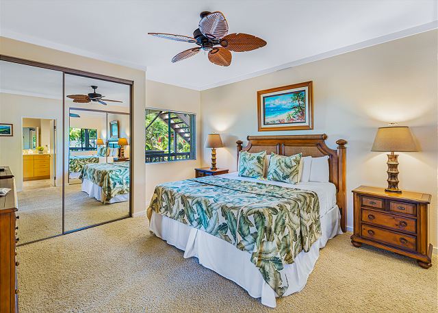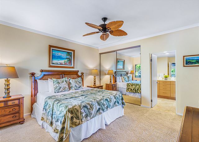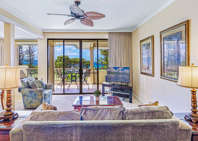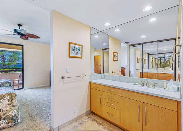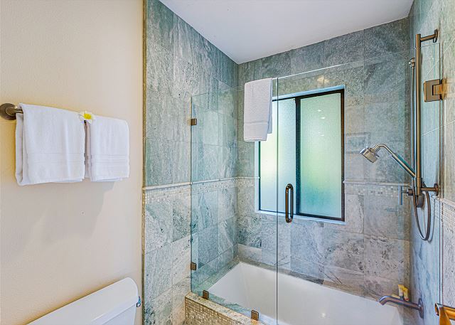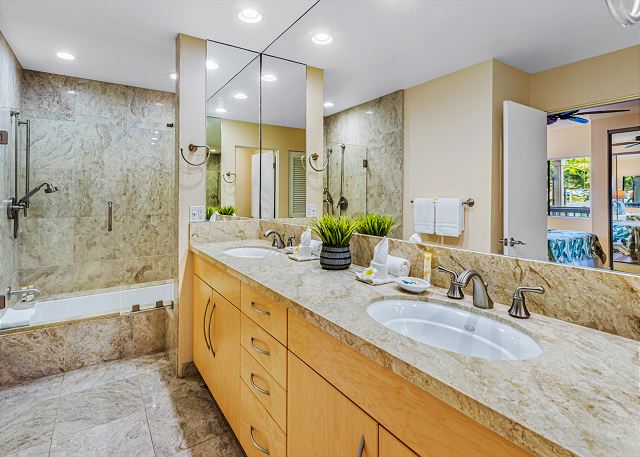 This lovely villa is at the terrace level. No stair cases to navigate, just a straight shot from your covered carport to your front door. Inside, two spacious and luxurious private master suites, a well equipped chef's kitchen, open to the main living area and boasting magnificent ocean views and fresh pacific breezes. After a long day of golf or hiking, enjoy a long relaxing bath in the large soaking tub.